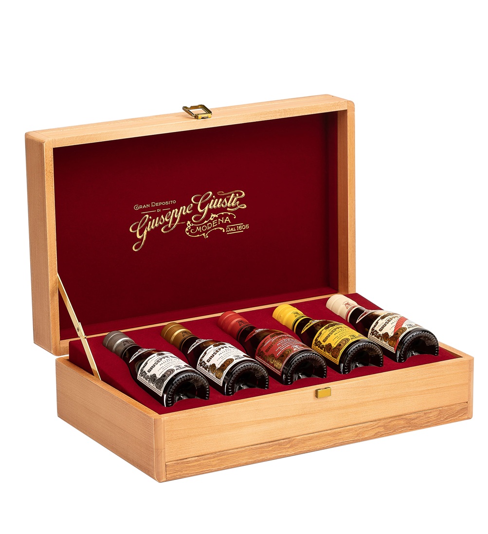 Born from the same idea of the Scrigno, made at the request of the late Tenor Luciano Pavarotti on the occasion of his Foundation’s charity auction, these fine wooden Collections offer to Balsamic Vinegar of Modena lovers a tasting tour of the Giusti’s Historical Collection: five Balsamic Vinegars of Modena of different recipes and increasing lengths of aging in the classic shapes.