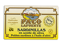 The small sardines (Sardina pilchardus) are sourced in the Atlantic Ocean and the Mediterranean Sea. Paco Lafuente Sardinillas are cleaned, selected, and categorised by hand and preserved in Spanish Olive Oil. Product of Spain.
